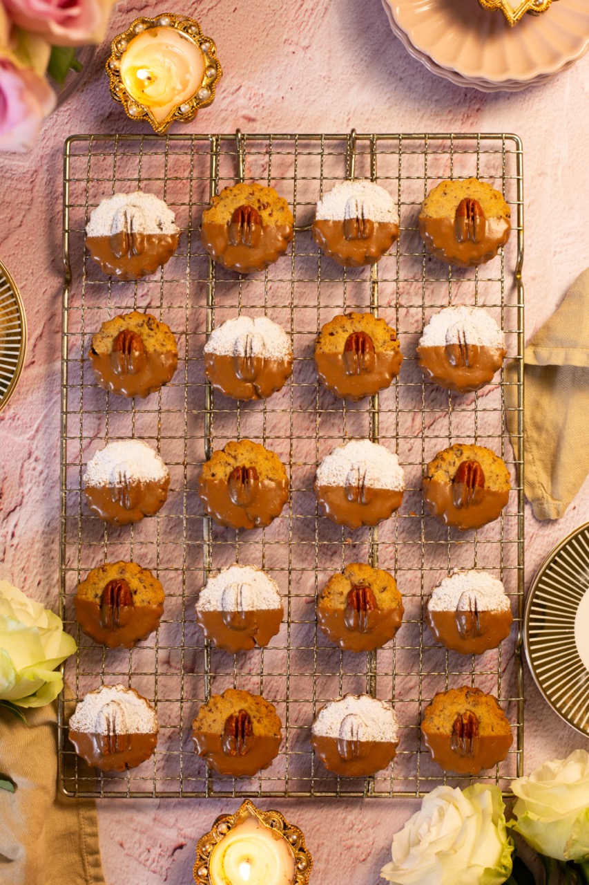 A delicious, crunchy biscuit that is flavoured with toasted pecans and dipped in milk chocolate