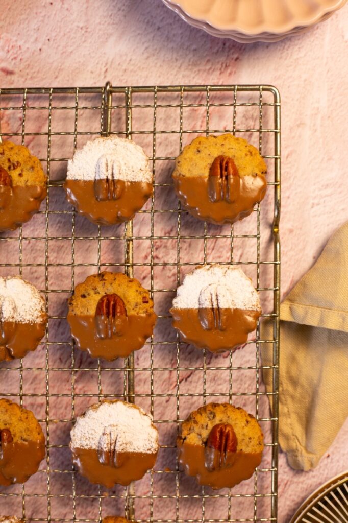 - Add a whole pecan and chill: Press a whole pecan (make sure you did not toast these or they will get too brown in the oven) into the middle of the biscuit and then set in the fridge to chill for about an hour, until the biscuits are firm to the touch. Make sure to leave a bit of space between each biscuit, but I usually fit 12 on a tray and that is fine, they do not spread much, especially if chilled.