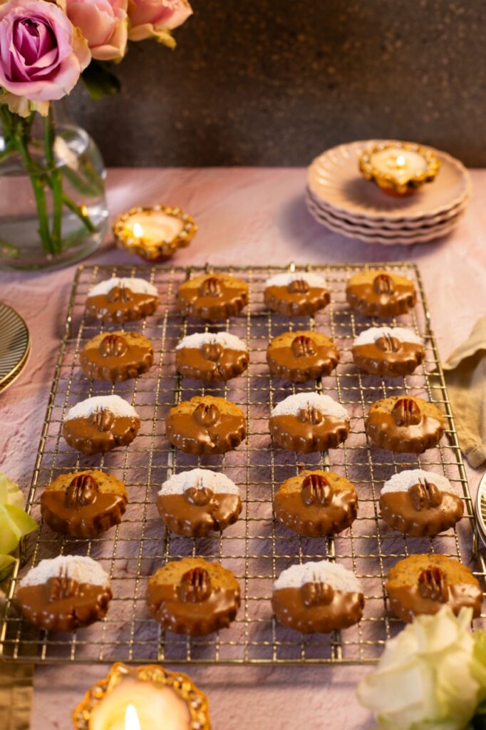 - Add in the dry ingredients: Then add in the flour and pecan nuts and knead to form a soft dough. I usually knead this by hand as mixing in the large pecan pieces with a mixer sometimes breaks them down even further and the texture is too fine.