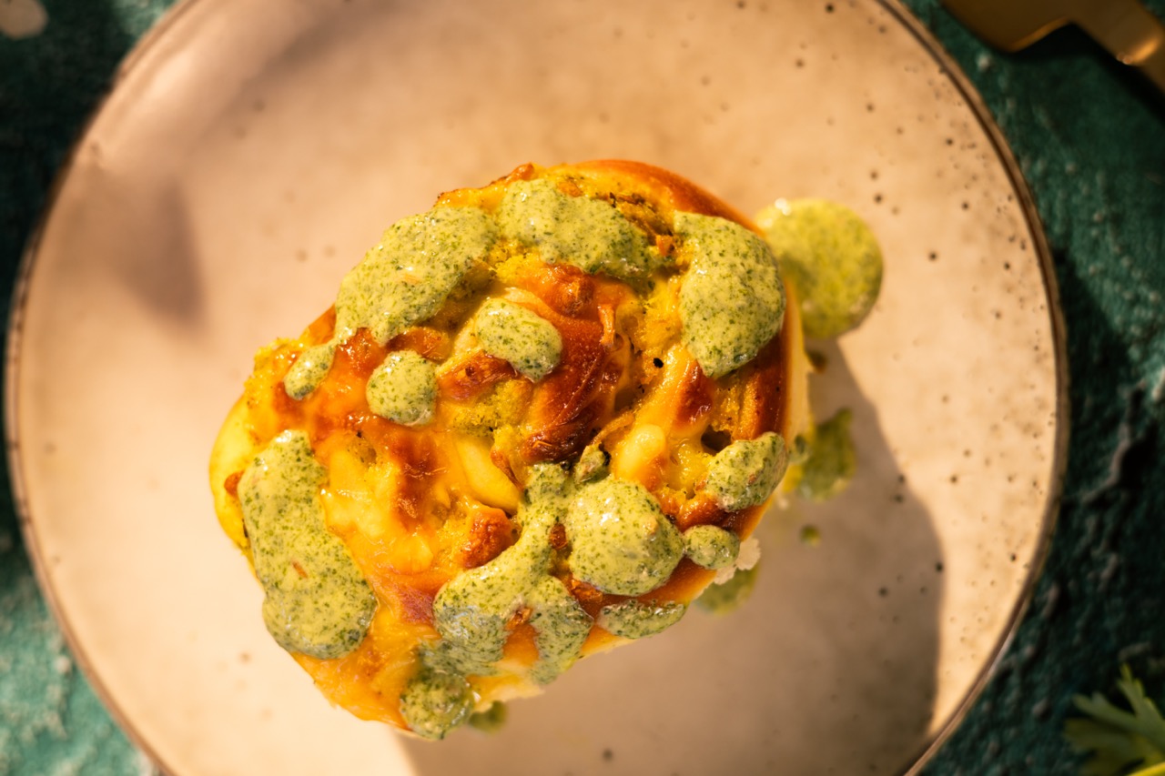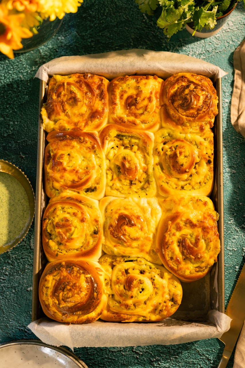 15. Remove from the oven and brush with a bit of melted butter, before enjoying. Serve the remaining green chutney alongside the bun.